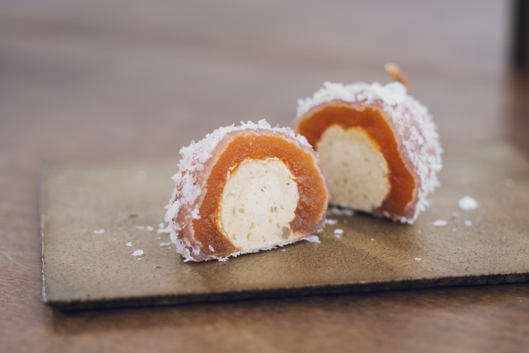 この「栗白寿柿」は、長野県の指定農家から届く、あめ色の果肉で上品な甘さの市田柿の中に栗金飩を詰めてたお菓子。周りにふりかけられた、もち米を乾燥させた氷餅は、晩秋から初冬の風情を感じられます。もっちりとした食感の市田柿とホクホクとした栗金飩の甘みがほどよく調和し、ほっと落ち着く味わいです。