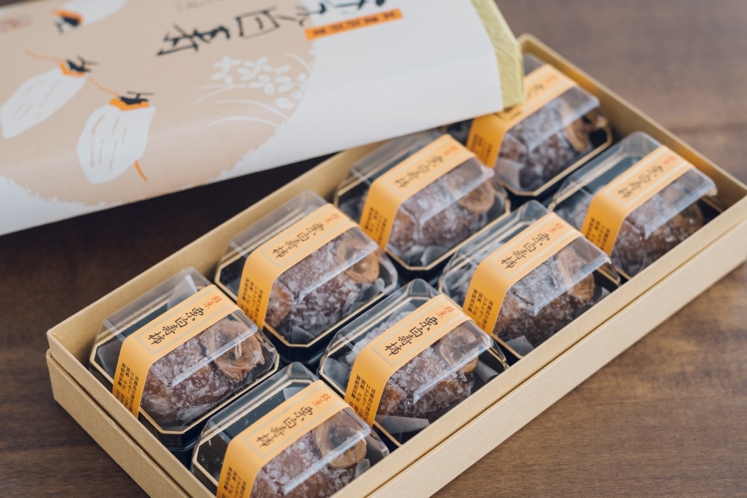 岐阜県八百津(やおつ)の特産品の栗と長野県の市田柿の美味しさを一度に楽しめるお菓子。もっちりとした市田柿と栗の粒が残るホクホクとした食感で、控えめな甘みと雑味のない上品な口当たりの栗金飩がコラボ。