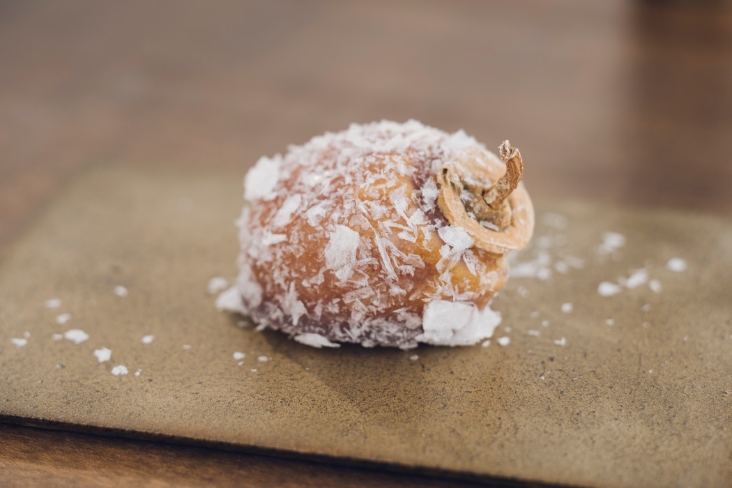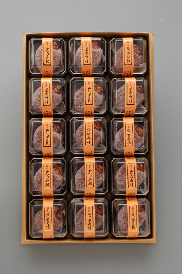 この「栗白寿柿」は、長野県の指定農家から届く、あめ色の果肉で上品な甘さの市田柿の中に栗金飩を詰めてたお菓子。周りにふりかけられた、もち米を乾燥させた氷餅は、晩秋から初冬の風情を感じられます。もっちりとした食感の市田柿とホクホクとした栗金飩の甘みがほどよく調和し、ほっと落ち着く味わいです。