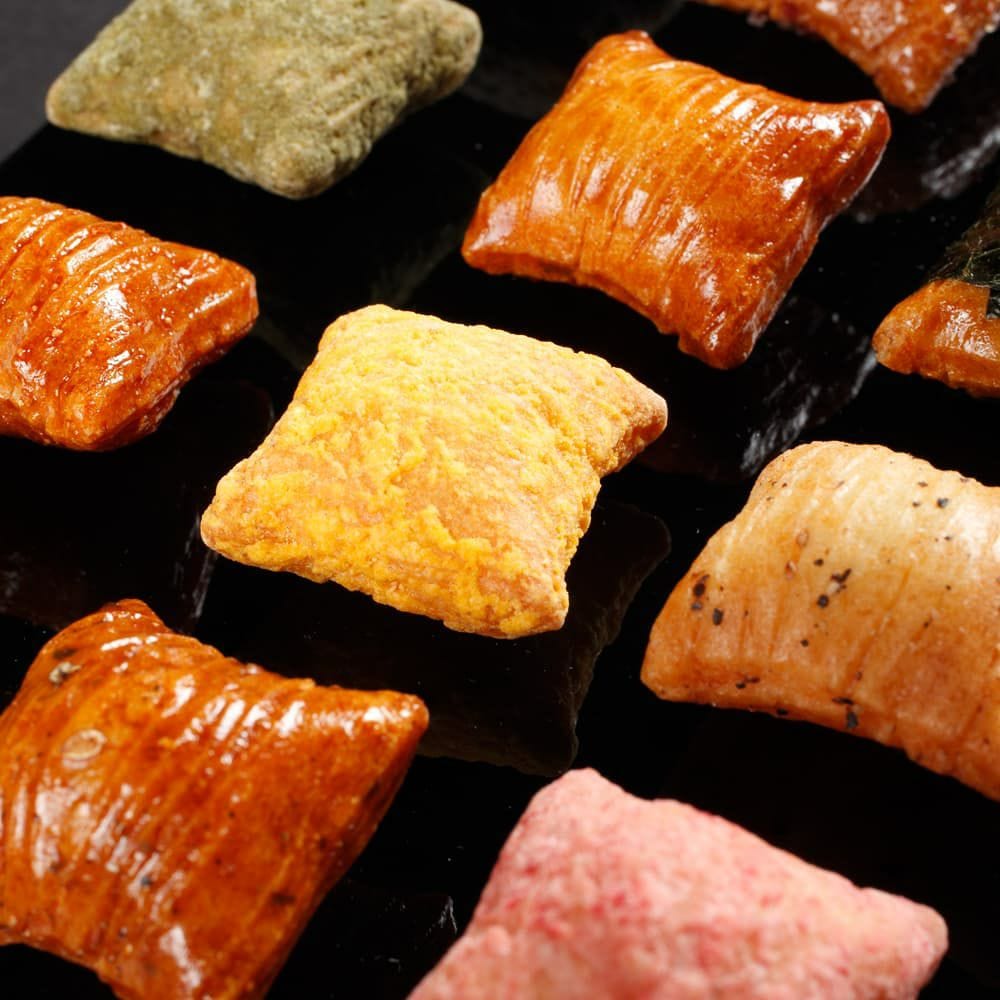 こだわりの素材を用いて伝統的な製法により作りあげた少し厚手のあられ。宇治抹茶、南高梅を用いた和三盆とざらめ、京七味など12種の味は、 四季折々に美しく移り変わりゆく京の12ヶ月を表現しています。