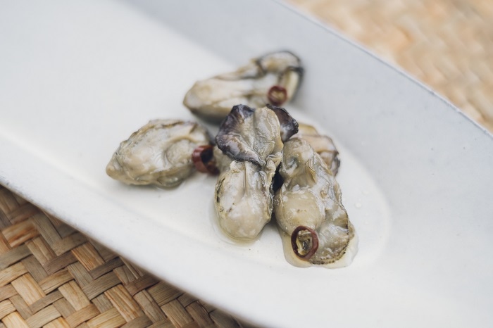 桜のチップでスモークした鳥羽市「浦村牡蠣」のオイル漬け。バゲットに乗せてブルスケッタにしたり、残ったオイルをパスタの隠し味にするのもおすすめです。