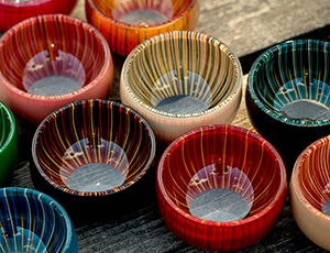 一度に塗れるのは一色のみのため、漆が乾くのを待ち、日を変えて異なる色を重ねていきます。 ひと月に生産できるのはせいぜい100個とのこと。 効率の点では大量生産品に遠く及びませんが、唯一無二の存在感からじわじわとオーダーが増え、漆硝子製品は、売上の7割を占めるまでに成長しました。