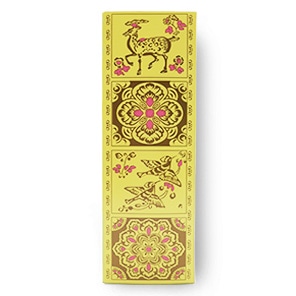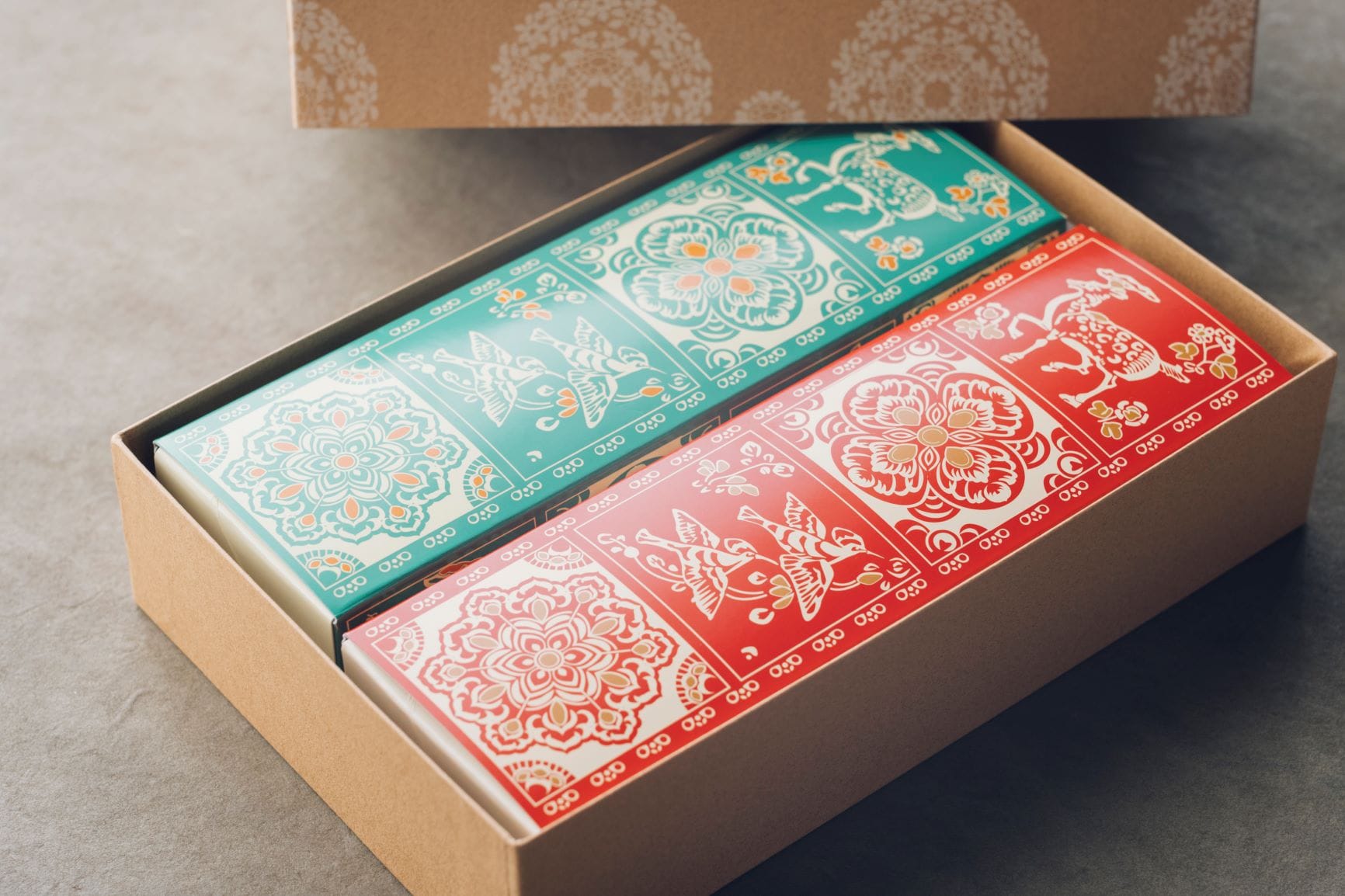 菓子を包む、正倉院文様のパッケージが何ともモダンでエキゾチック。印象に残るハイセンスな手土産として、大切なシーンに花を添えます。