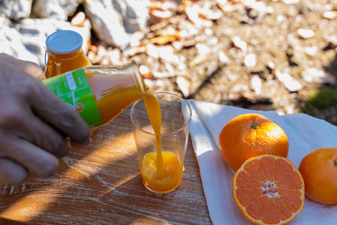 三ケ日のみかん農園が、青島みかんの甘みが増す時期を見極め、手作業で一つずつ皮を剥いて搾った果汁100%ジュース。保存料・着色料・香料を使用せず、青島みかんを食べているかのようなおいしさを味わえます。